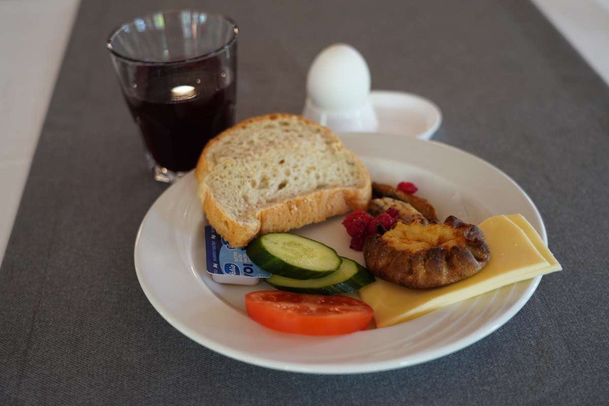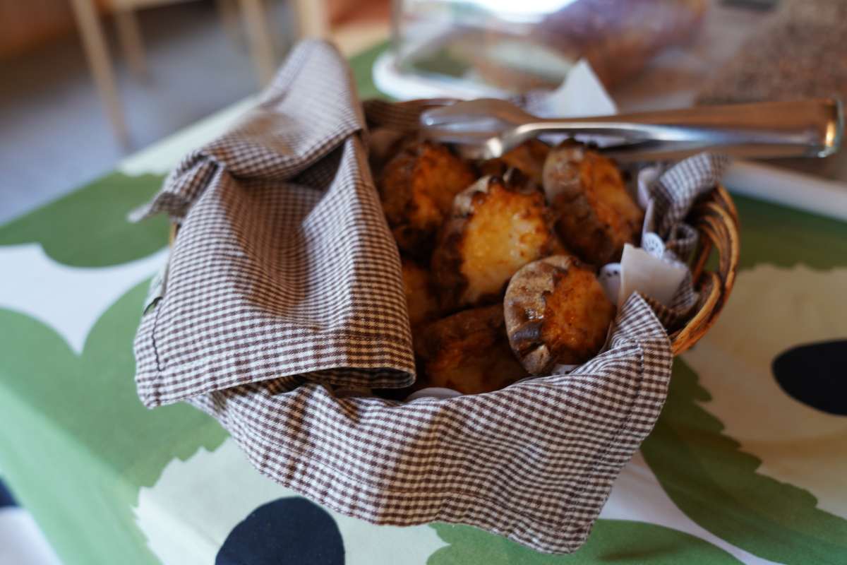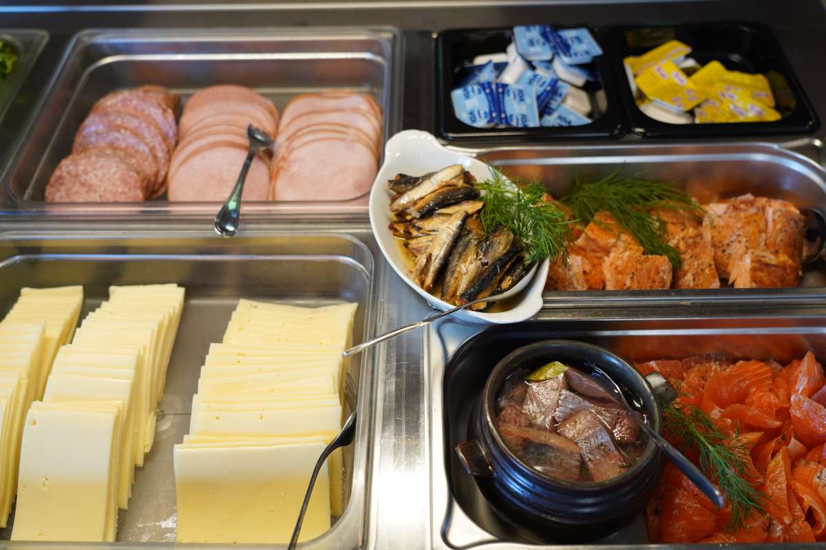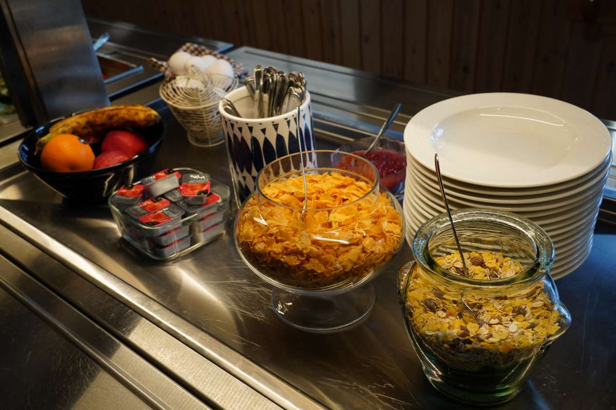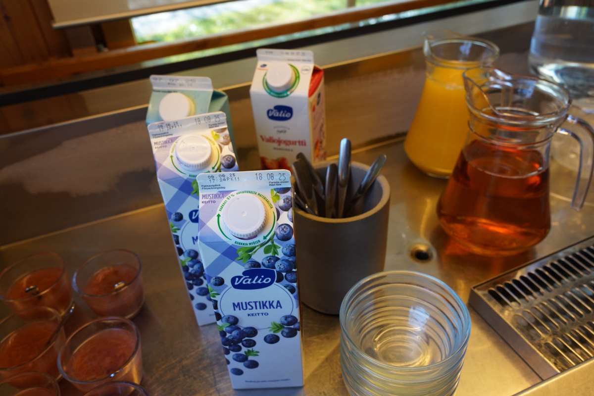 Das Frühstück-Büfett im Ruokkeen Lomakylä überzeugt mit lokalen Spezialitäten: Es gibt herzhafte Wurst, Käse, Räucher- und Flammlachs, eingelegte Maränen, karelische Piroggen und Kaurapuuro, einen finnischen Haferbrei sowie Cornflakes und Müsli. Dazu gibt es Kaffee, Tee, Milch, Obst und Blaubeersaft.