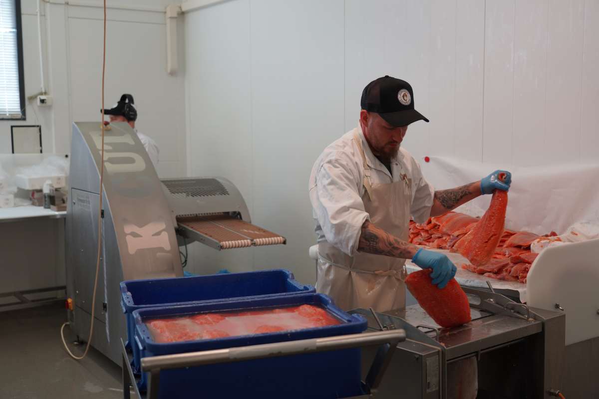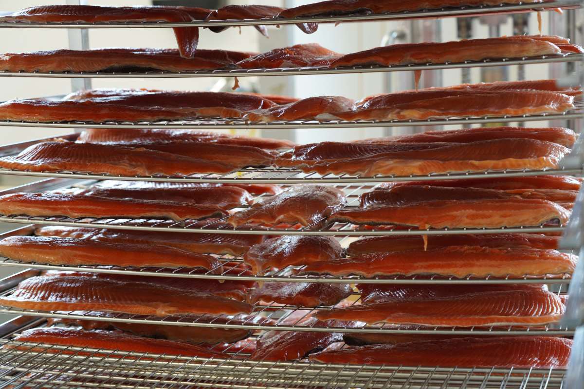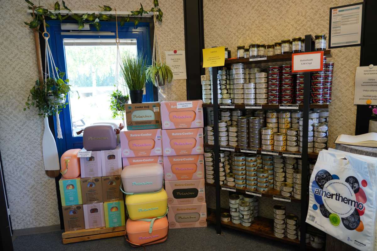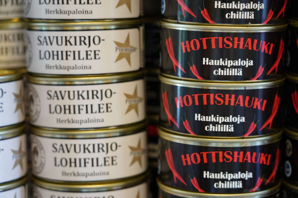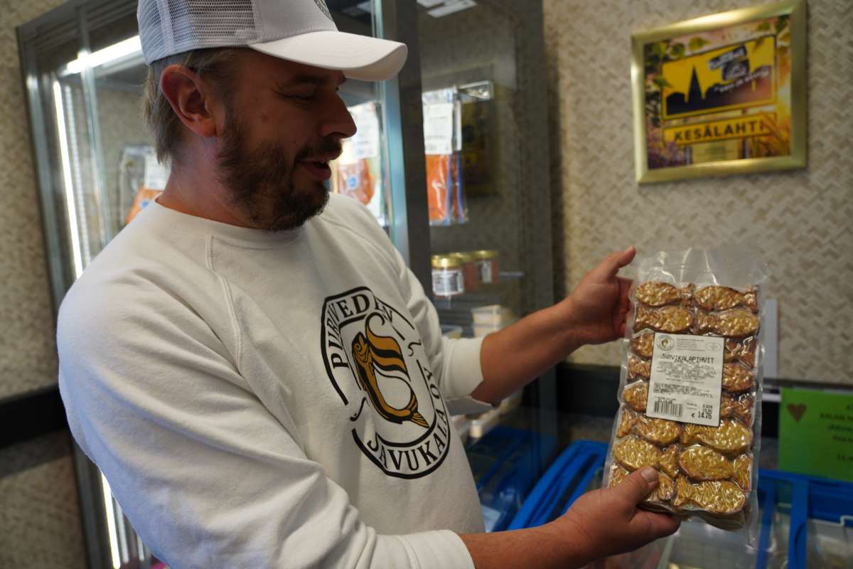 Nach dem Frühstück begleitet uns Rauno Jussila, der Kommunikatiosmanager der Stadt Kitee, den wir beim Frühstück kennengelernt haben, zur Fischfabrik Puruveden Savukala in Kesälahti. Seit über 30 Jahren räuchert und verarbeitet das Unternehmen hier Fisch aus dem Puuruvesi und Pyhäjärvi. Während wir die familiengeführte Fischfabrik besichtigen erklärt Inhaber Mikko Jokinen uns das traditionelle Verfahren: Der Fisch wird mit grobem Meersalz gesalzen und über echtem Erlenrauch kalt geräuchert. So erhält er sein besonderes Aroma. Im Anschluss besuchen wir den unternehmenseigenen Fabrikladen. Hier gibt Räucherfisch-Spezialitäten, Tiefkühlfisch und Konserven wie Maränen in Öl und Hecht in Chilisoße sowie Fischstäbchen in Fischform für Kinder und sogar Hunde- und Katzenfutter aus Fisch.
