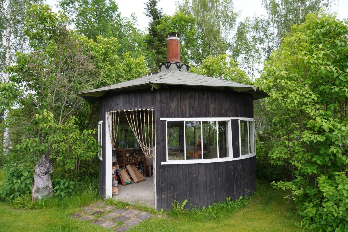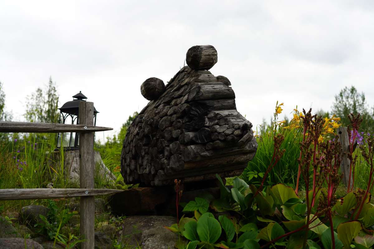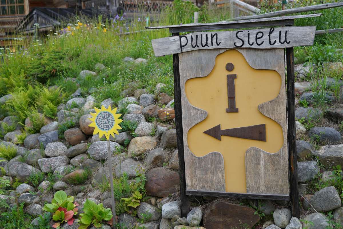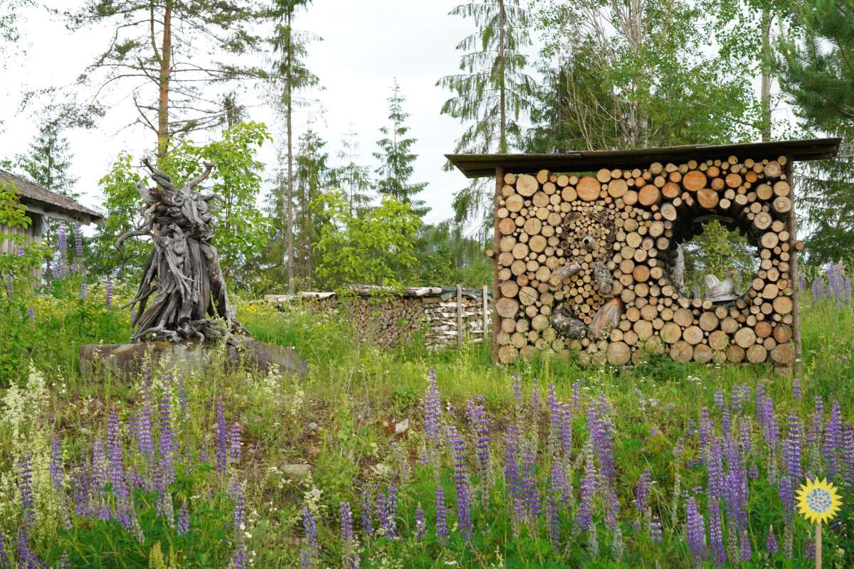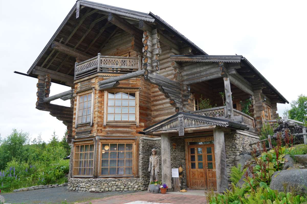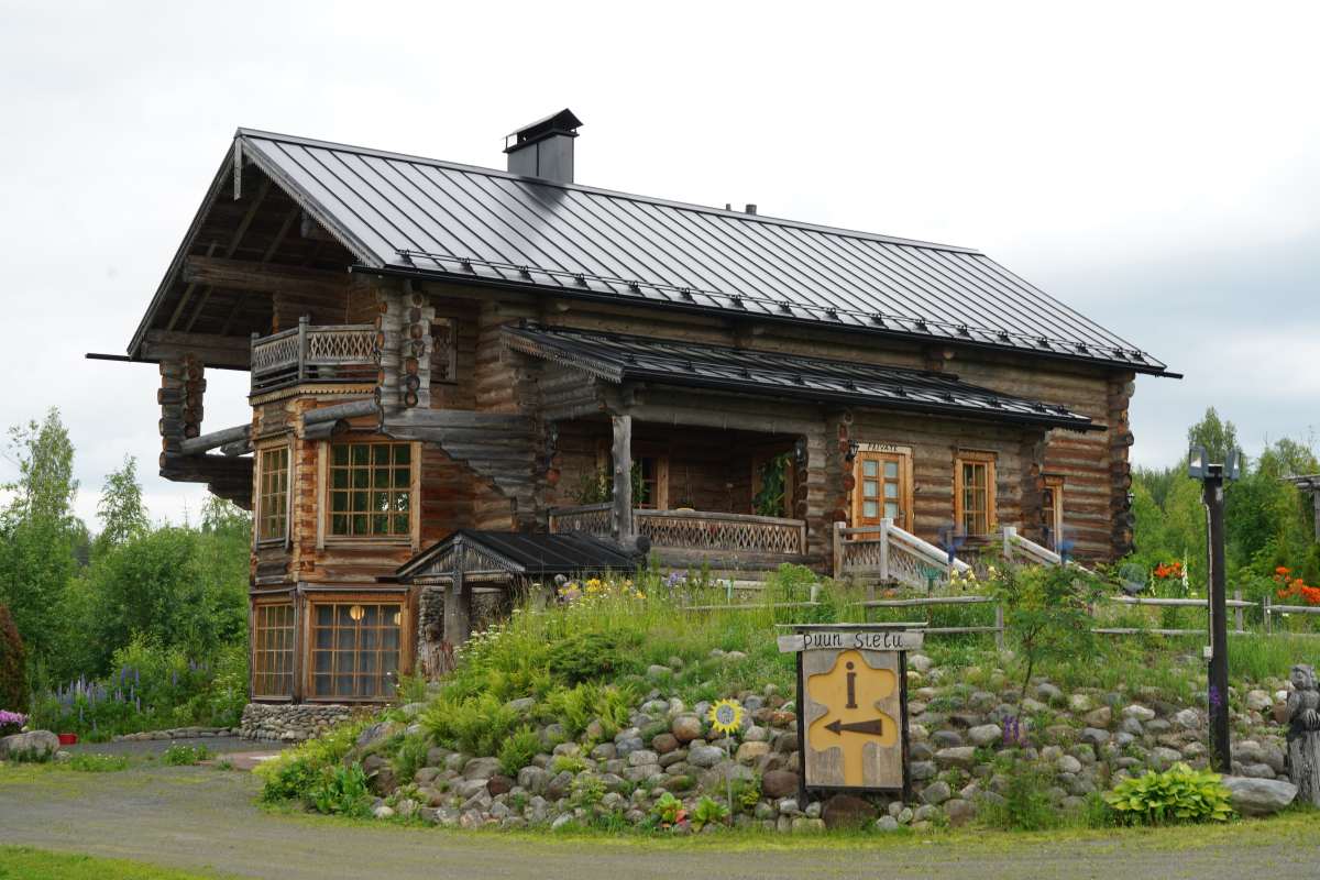 Und die Region Nordkarelien bietet noch mehr vor allem für Kunstinteressierte: Die Region ist nämlich auch ein pulsierendes Zentrum für Kunst und Kreativität. Da wir nach dem offiziellen Programm noch ein wenig Zeit haben, besuchen wir die Künstlerresidenz Puun Sielu in Onkamo. Eingebettet im Wald, verwandelt sich das Anwesen mit dem märchenhaften Holzhaus „Onnela“ jeden Sommer in einen Treffpunkt für Künstler aus aller Welt. Unter einem festen Motto entstehen hier Auftragsarbeiten, die von absoluter künstlerische Freiheit zeugen. Die Künstler leben während ihres Aufenthaltes im Haupthaus oder in kleinen Hütten auf dem Gelände, umgeben von unberührter Natur.