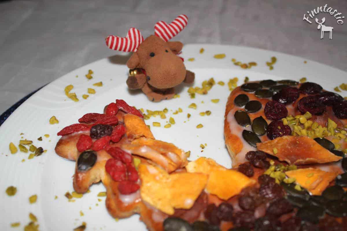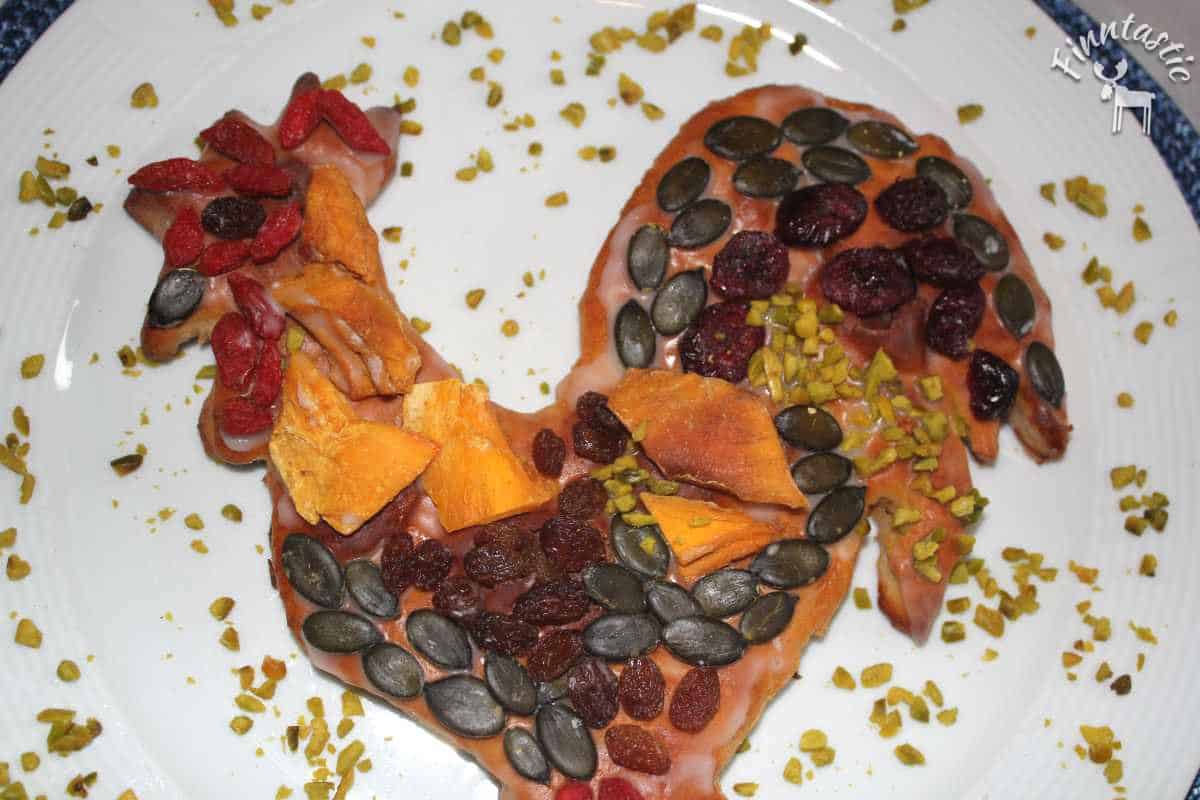 Für das Auge könnt ihr beispielsweise eine dunkle Rosine nutzen, für den Kamm, z.B. die roten Goji-Beeren und für das restliche Federkleid die getrockneten Mangoscheiben, Rosinen, Cranberries und Pistazien. Ihr könnt euch natürlich auch anderes Trockenobst oder Kerne zum Dekorieren aussuchen.